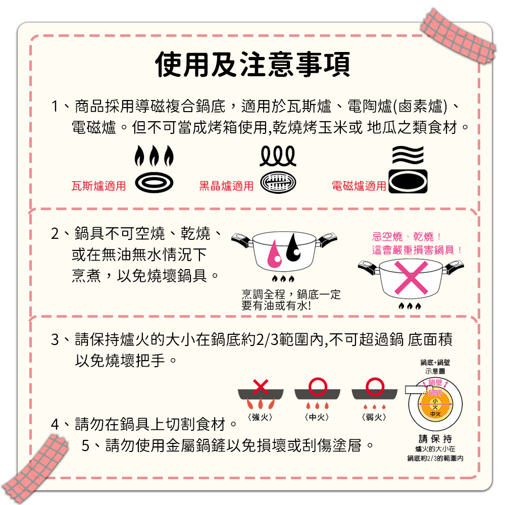 9、本商品不適用烤箱、微波爐、洗碗機、烘碗機,避免損壞鍋體。